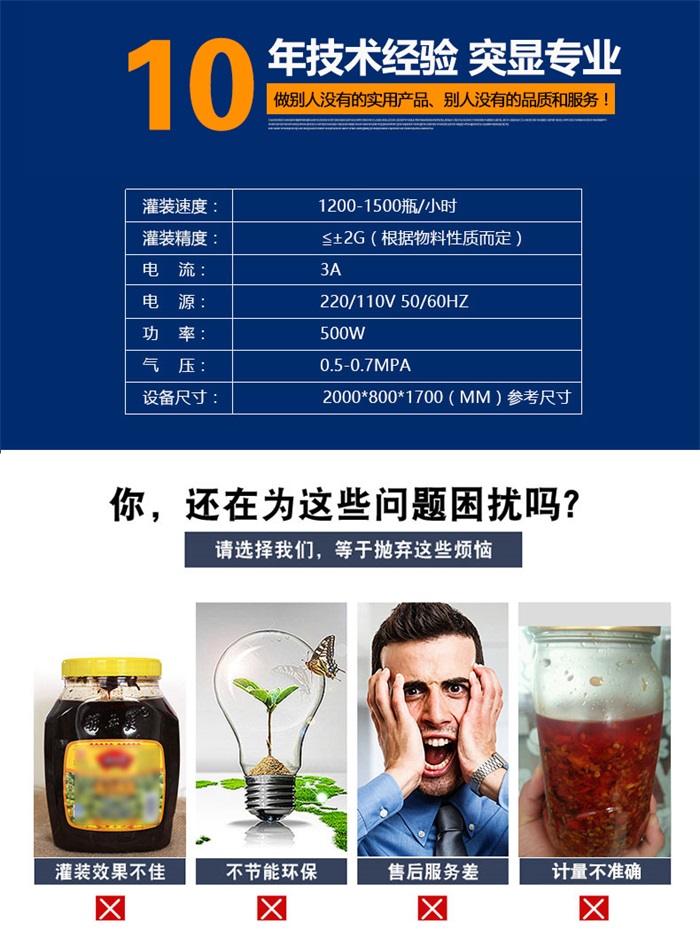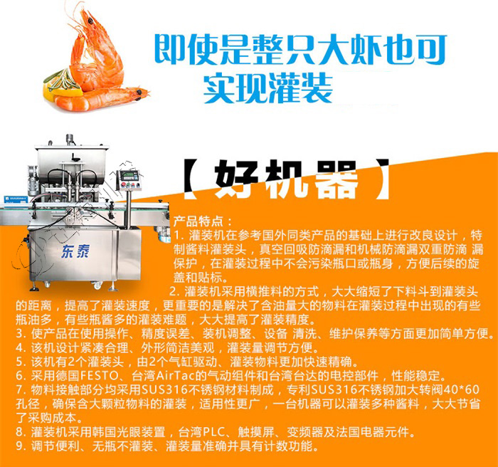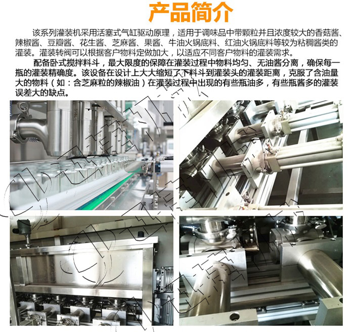 該系列灌裝機采用活塞式氣缸氣動原理,適用于調味品中帶顆粒并且濃度較大的香菇醬、辣椒醬、豆瓣醬、花生醬、芝麻醬、果醬、牛油火鍋底料、紅油火鍋底料等較為粘稠醬類的灌裝。灌裝轉閥可以很具客戶物料定做加大,以適應不同客戶物料的灌裝需求。配備臥式攪拌料斗,限度的保障在灌裝過程中物料均勻、無油醬分離,確保每一瓶的灌裝精確度,該設備在設計上大大縮短了下料斗到灌裝頭的灌裝距離,克服了含油量大的油料(如:含芝麻粒的辣椒油)在灌裝過程出現(xiàn)的有些瓶油多,有些瓶醬多的灌裝誤差大的缺點。