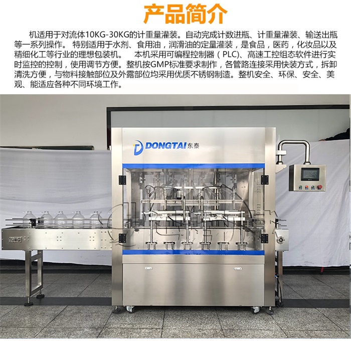 機(jī)適用于對(duì)流體5kg-30kg的計(jì)重量灌裝。自動(dòng)完成計(jì)數(shù)進(jìn)瓶、計(jì)重量灌裝、輸送出瓶等一系列操作。 特別適用于水劑、食用油,潤滑油的定量灌裝,是食品,醫(yī)藥,化妝品以及精細(xì)化工等行業(yè)的包裝機(jī)。本機(jī)采用可編程控制器(PLC)、高速工控組態(tài)軟件進(jìn)行實(shí)時(shí)監(jiān)控的控制,使用調(diào)節(jié)方便。整機(jī)按GMP標(biāo)準(zhǔn)要求制作,各管路連接采用快裝方式,拆卸清洗方便,與物料接觸部位及外露部位均采用優(yōu)質(zhì)不銹鋼制造。整機(jī)安全、環(huán)保、安全、美觀、能適應(yīng)各種不同環(huán)境工作。