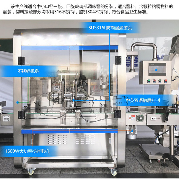 如今在濃醬類灌裝市場里,濃醬的種類越來越多,自動濃醬罐裝機因為醬料的濃稠性,自動濃醬灌裝機的灌裝起來會有很多問題,比如油醬的分離是大家一直考慮的問題,大家都知道,油醬分離首先就是油醬不均勻,在超市里我們買醬時候有時候會碰到這種問題,有的油多有的醬多,我們自然不會去挑選這種,再者油醬分離還會影響口感,那我們迅捷機械根據(jù)油醬分離的這種問題做出了調整。